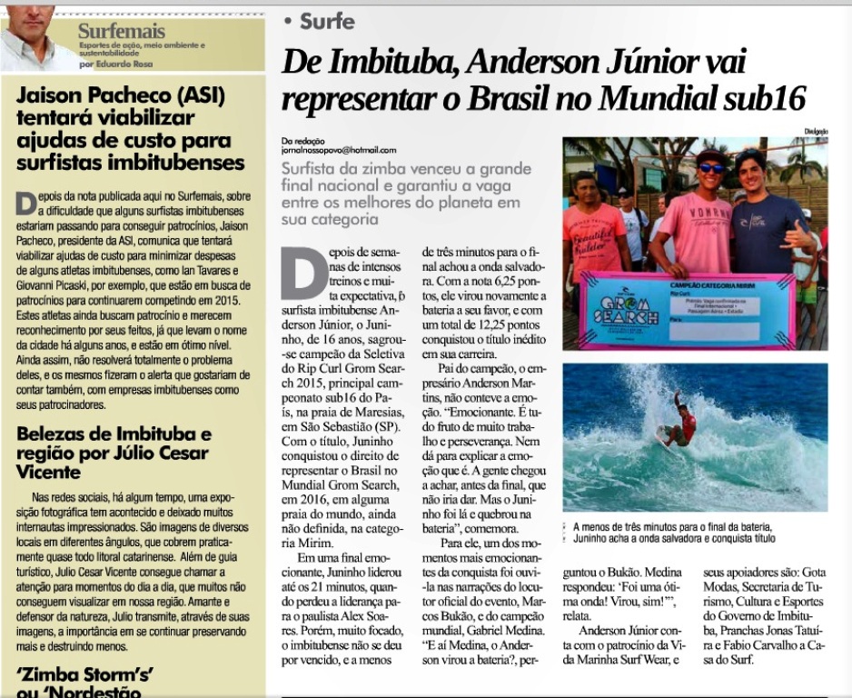 Neste período mostramos o que de melhor aconteceu no meio dos esportes de ação, trazendo informação sobre nossos atletas, em que culminamos, inclusive, com a consagração de dois grandes campeões, tão novos e tão dedicados, como Anderson Junior e Leonardo Barcelos, que irão representar Imbituba, SC e o Brasil no Mundial Grom Search neste ano - em maio - e em 2017.